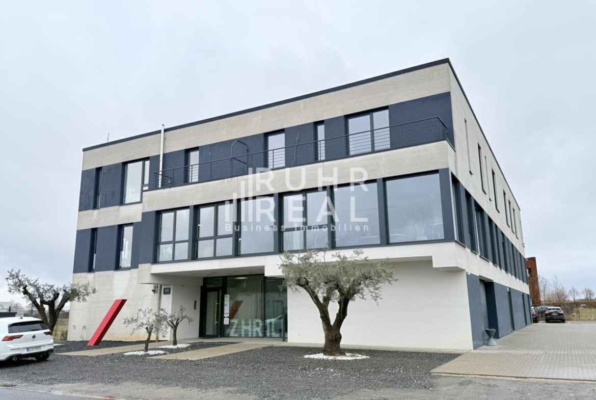 Die Büroflächen im 1. Obergeschoss umfassen insgesamt drei Einheiten mit ca. 110 m², 190 m² und 340 m² und präsentieren sich als Zweitbezug in neuwertigem Zustand. Die Ausstattung umfasst eine moderne Glasfaserverkabelung über Bodentanks, LED-Paneelbeleuchtung, bodentiefe Fenster sowie teilweise vorhandene Balkone, die für helle und angenehme Arbeitsbereiche sorgen. Ein Serverraum, ein Personenaufzug sowie ein behindertengerechtes WC gewährleisten eine zeitgemäße und barrierearme Nutzung. Ergänzend stehen sechs Pkw-Stellplätze zu je 35,00 EUR monatlich zur Verfügung.