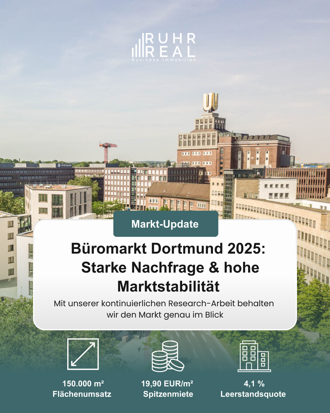 Dortmund überzeugt durch seine wirtschaftliche Stabilität, ein vielfältiges Flächenangebot und eine kontinuierlich hohe Nachfrage. Gerade qualitativ hochwertige Büroflächen mit zeitgemäßer Ausstattung und guter Anbindung stehen im Fokus der Nutzer.