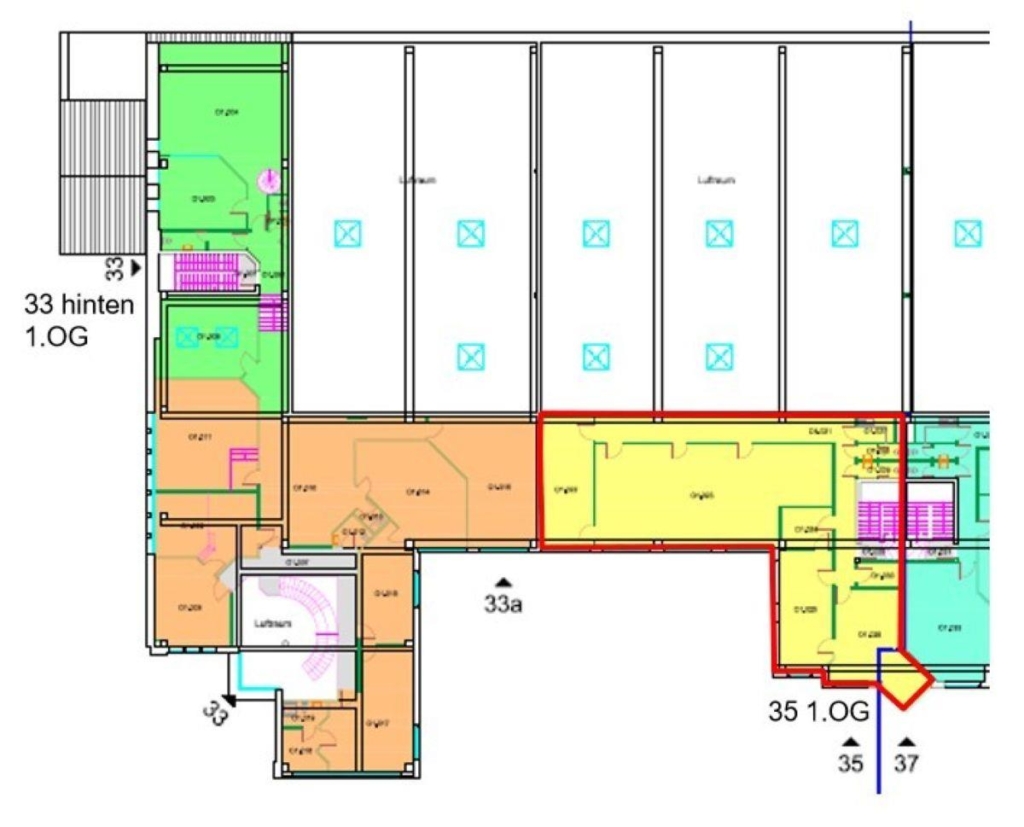 Das moderne Bürogebäude besticht durch seine Ecklage und dessen hervorragende Werbemöglichkeiten. Vor dem Objekt stehen ausreichende Parkflächen zur Anmietung bereit.