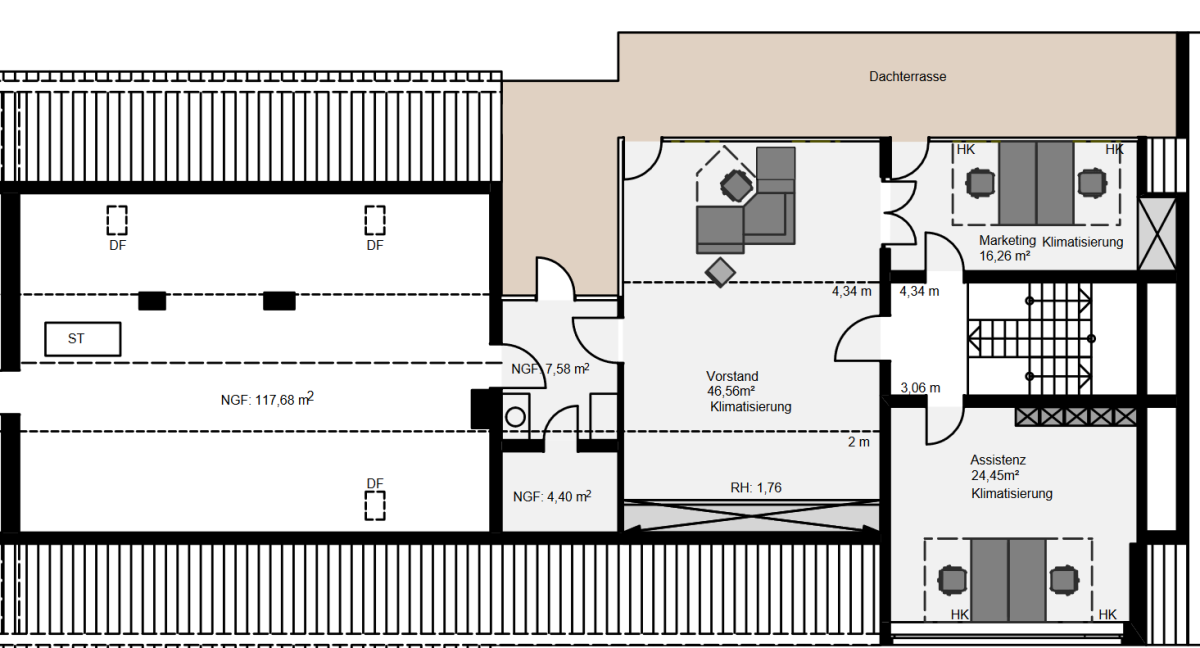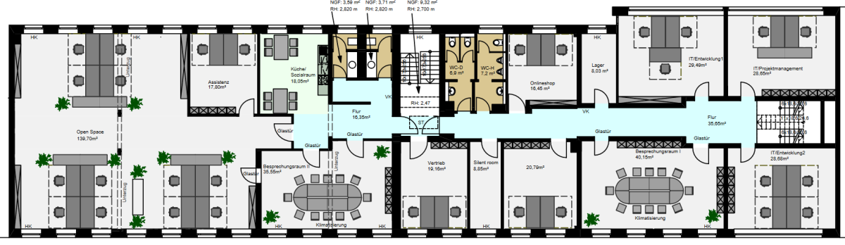 Das Objekt besticht durch die moderne Ausstattung und den ruhigen Mieterstamm. Das Büro im 2. OG verfügt über den oft gesuchten Mix aus Zellenbüros, sowie Open Space Flächen, welche modern und hochwertig ausgestattet sind. Die Büroeinheit ist über eine innenliegende Treppe mit dem Dachgeschoss verbunden, in dem sich neben weiteren Büros und einer Küche, eine attraktive Dachterasse befindet, die sich perfekt für die gemeinsame Mittagspause nutzen lässt. Zudem steht ein ausgebauter aber mit Schrägen versehenen Raum zur Verfügung, welcher als interner Fitness- oder Abstellraum genutzt werden kann.