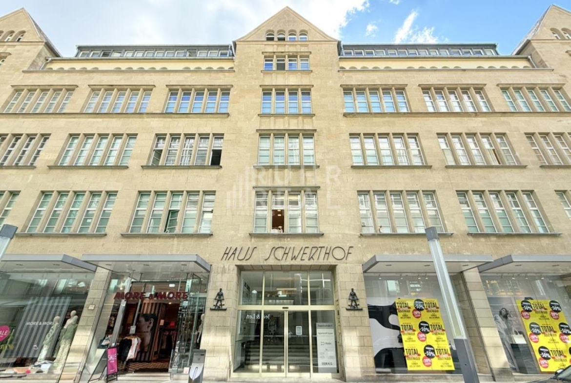 Der denkmalgeschützte Schwerthof im Herzen von Köln ist eine traditionsreiche Adresse, die seit über 100 Jahren das Stadtbild prägt und sich bis heute im Familienbesitz befindet. Zu den bekanntesten Mietern gehört das Stammhaus des Modehändlers Appelrath & Cüpper. Die angebotenen Flächen zeichnen sich durch einen modernen Open-Space-Charakter aus, der durch großzügige Glaswände als raumtrennende Elemente unterstrichen wird. Eine CAT-5E-Verkabelung sowie ein separater Serverraum sorgen für eine zeitgemäße technische Infrastruktur. Die Räume sind klimatisiert bzw. verfügen über eine Raumkühlung und bieten durch moderne Brüstungskanäle eine flexible Arbeitsplatzgestaltung. Eine Zugangskontrolle mit Videogegensprechanlage, ein Personen- und Lastenaufzug sowie eine eingerichtete Teeküche – die bei Bedarf übernommen werden kann – ergänzen die Ausstattung. Ebenfalls besteht die Möglichkeit, vorhandenes Mobiliar zu übernehmen. Hohe Decken mit moderner LED-Deckenbeleuchtung schaffen eine angenehme Arbeitsatmosphäre. Zusätzlich kann optional ein ca. 11 m² großer Kellerraum angemietet werden.