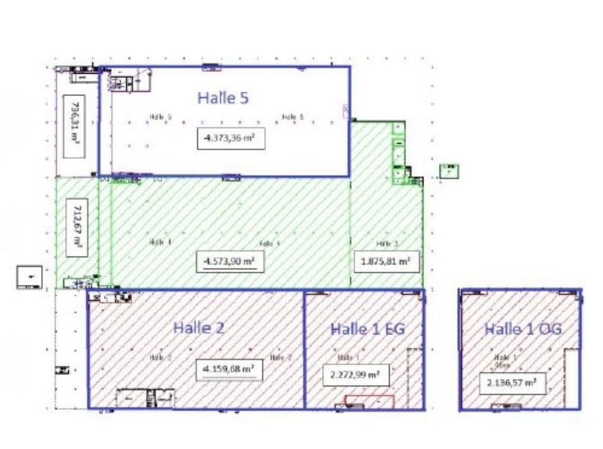 Die Liegenschaft hat eine Gesamtfläche von ca. 27.000 m² und ist unterteilt in drei Hallenschiffe mit angrenzenden Büroflächen. Die Andienung erfolgt über 10 Verladerampen. Die Deckenhöhe beträgt 8,00 m UKB. Dem Nutzer stehen ausreichend Stellplätze im Außenbereich zur Verfügung.